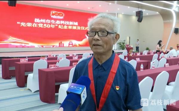 扬州市“光荣在党50年”纪念章获得者唐存福表示:“这个拿金子买不到的荣誉,无比的幸福。祝福我们国家更加强盛。”