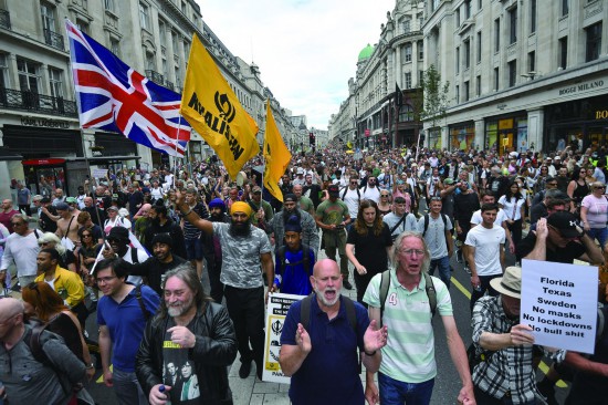 图片说明:当地时间26日,英国伦敦爆发反对疫苗和封锁的大游行。