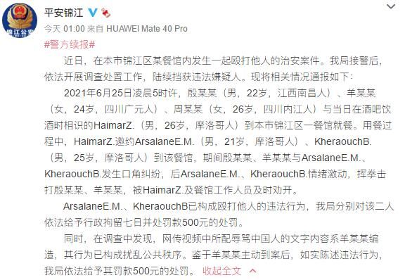 荔枝新闻讯 昨日(6月27日)成都市公安局锦江分局官方微博发布两则警方通报,通报关于“男子在九眼桥某餐馆被外籍人员殴打”的情况。今日凌晨发布“警方续报”:近日,在本市锦江区某餐馆内发生一起殴打他人的治安案件。成都市公安局锦江分局接警后,依法开展调查处置工作,陆续挡获违法嫌疑人。现将相关情况通报如下: