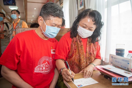 6月25日,上海旅客张英霞(右)在Y701次列车上写纪念明信片。新华社记者 江汉 摄