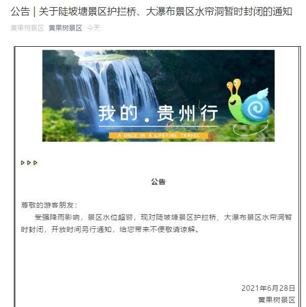 荔枝新闻讯 据微信公号“黄果树景区”6月28日公告,受强降雨影响,黄果树景区水位超警,现对陡坡塘景区护拦桥、大瀑布景区水帘洞暂时封闭,开放时间另行通知。