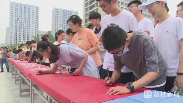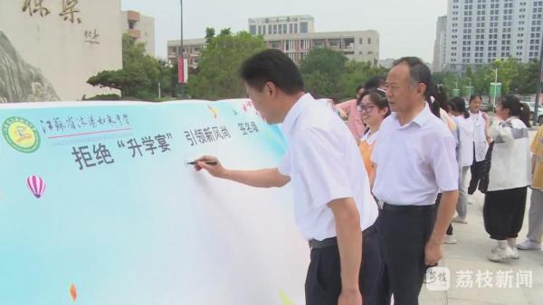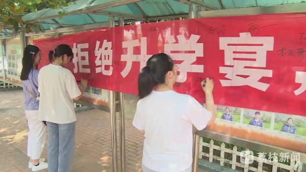 今天(6月28日)上午,在沭阳高级中学、沭阳如东中学等九所高中学校,万名师生同步在印有“拒绝‘升学宴’引领新风尚”签名墙和横幅上签名承诺,倡导家校共同发力,不办升学宴、不赴升学宴,文明表达升学的喜悦和感恩之情,不让升学的喜事成为别人的负担。