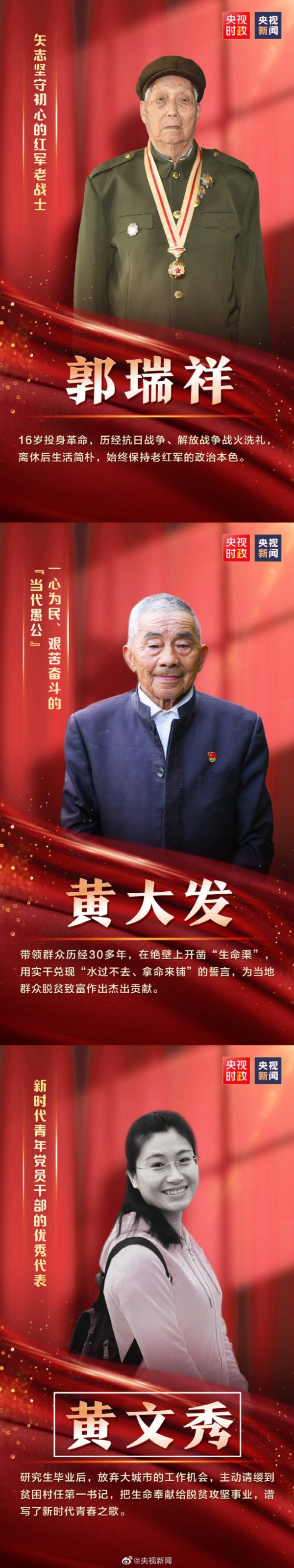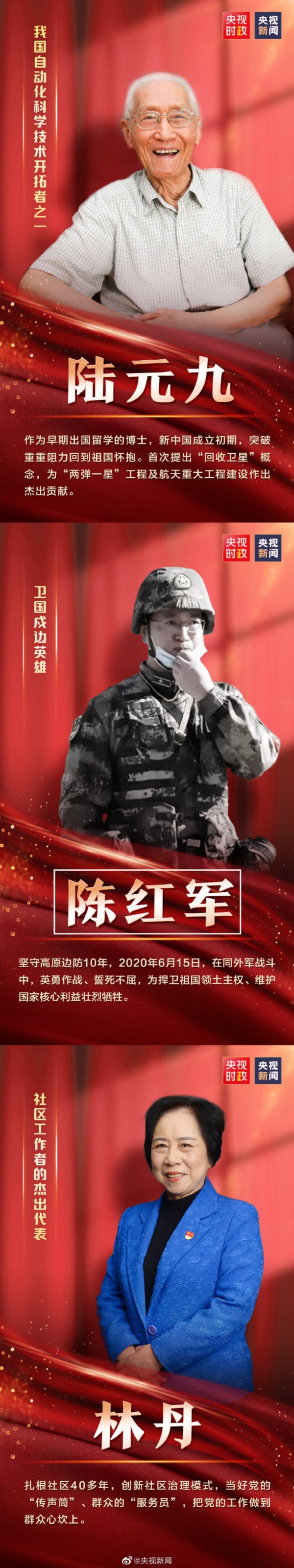 “七一勋章”首次颁授全名单:马毛姐、王书茂、王占山、王兰花、艾爱国、石光银、吕其明、廷·巴特尔、刘贵今、孙景坤、买买提江·吾买尔、李宏塔、吴天一、辛育龄、张桂梅、陆元九、陈红军、林丹、卓嘎、周永开、柴云振、郭瑞祥、黄大发、黄文秀、黄宝妹、崔道植、蓝天野、魏德友、瞿独伊。当之无愧!致敬最闪亮的星!