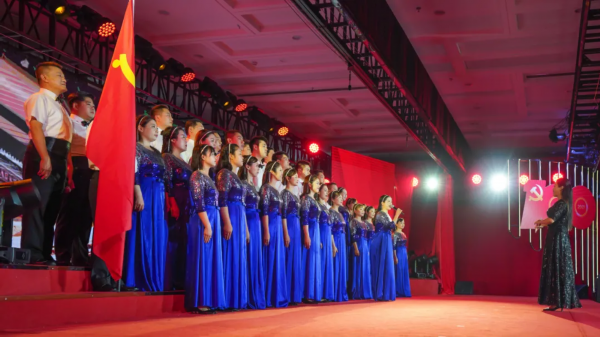 此次比赛分为“凝望初时路”“激荡开天地”“启航新征程”和“聚力创伟业”四个篇章,十六支队伍深情传唱红色歌曲,用歌声缅怀革命先烈、讴歌百年征程、传递爱国心声、彰显初心使命。活动最后,全体人员齐唱《国际歌》,向党和祖国献上真挚祝福。