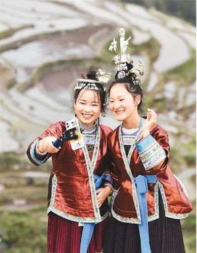 图为贵州省从江县加榜乡加车村村民直播推介加榜梯田风光。新华社记者 杨文斌摄。