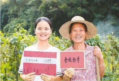 教育是民族振兴、社会进步的重要基石。当前,中国高等教育由大众化阶段向普及化阶段迈进。图为2020年9月8日,安徽安庆宿松县柳坪乡村民邓爱兰(右)和孙女吴婷华展示大学录取通知书和助学金。陈 晨摄(人民视觉)