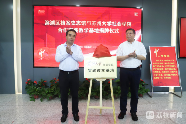 活动现场,滨湖区档案史志馆与苏州大学社会学院正式“联姻”,促成了该院在无锡设立首个校地合作实践教学基地,为双方交流档案管理技术、深化爱国主义教育载体开启新篇。滨湖区委书记马良与苏州大学社会学院院长高峰共同为基地揭牌。