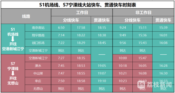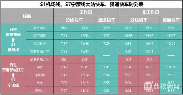 机场线、宁溧线大站快车实施一年以来,在出行提速方面取得积极成效,南京地铁在此基础上深挖潜力,持续完善设施设备功能,此次创新性增开贯通大站快车,将溧水站至南京南站行程时间进一步压缩至48分钟,贯通大站快车运行途中仅停靠南京南站、翔宇路南站、禄口机场站、溧水站、中山湖站、幸庄站和无想山站7站,乘客无需中途换乘,出行体验再提升。根据机场线、宁溧线客流特征及供车条件,每日早、晚高峰在客流主要方向各增开1列贯通大站快车,早高峰由无想山站运行至南京南站、晚高峰由南京南站运行至无想山站。当前线内快车开行列次仍维持不变,时间点微调优化。