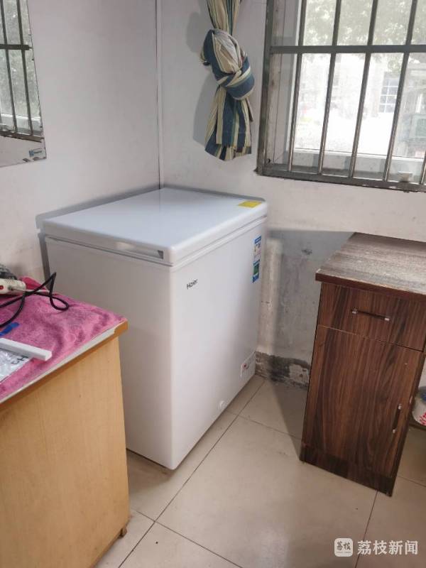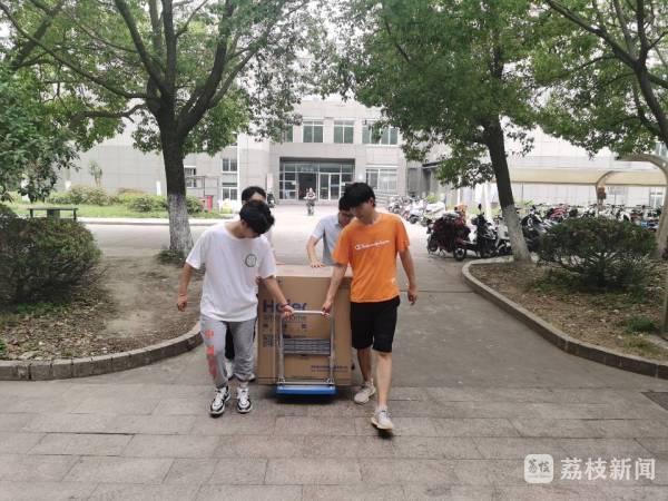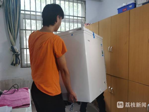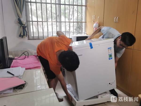 6月26日,扬州市职业大学宿管3号楼 ,师生将冰柜抬到值班室。