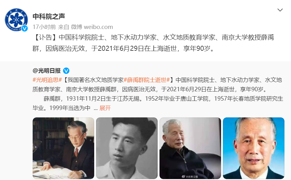 荔枝新闻讯 6月29日,据中国科学院官方微博消息,中国科学院院士、地下水动力学家、水文地质教育学家、南京大学教授薛禹群,因病医治无效,于2021年6月29日在上海逝世,享年90岁。