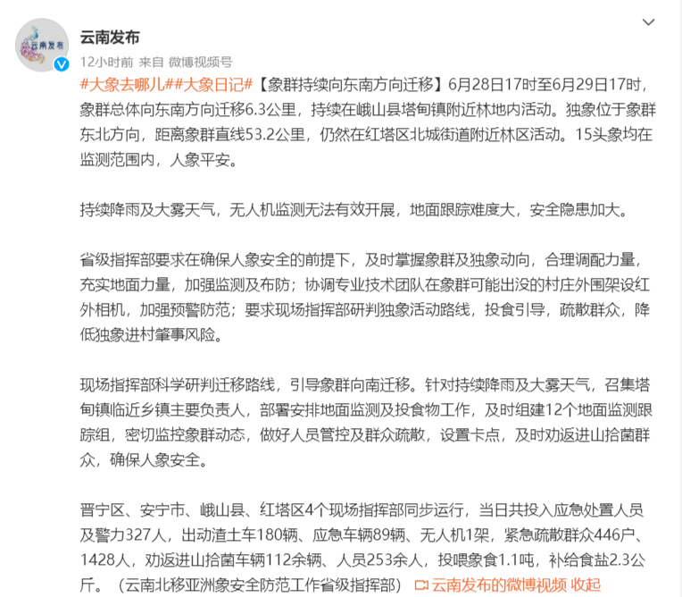 晋宁区、安宁市、峨山县、红塔区4个现场指挥部同步运行,当日共投入应急处置人员及警力327人,出动渣土车180辆、应急车辆89辆、无人机1架,紧急疏散群众446户、1428人,劝返进山拾菌车辆112余辆、人员253余人,投喂象食1.1吨,补给食盐2.3公斤。