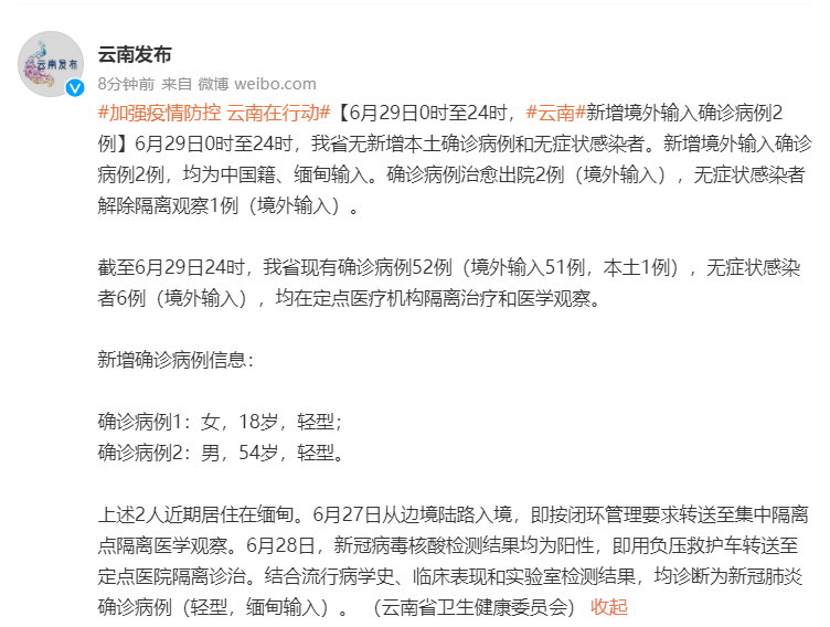 荔枝新闻讯 据“云南发布”微博消息,6月29日0时至24时,云南省无新增本土确诊病例和无症状感染者。新增境外输入确诊病例2例,均为中国籍、缅甸输入。确诊病例治愈出院2例(境外输入),无症状感染者解除隔离观察1例(境外输入)。
