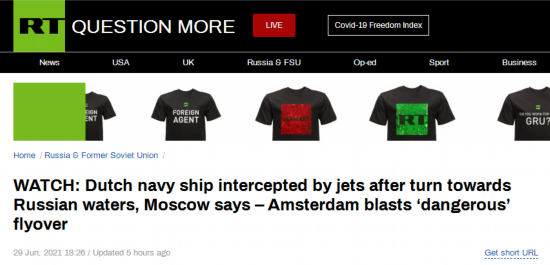 RT在报道中称,是荷兰国防部抱怨俄罗斯军机拦截行为“不安全”后,莫斯科对此事件发表了评论。荷兰国防部29日早些时候发表声明称:“俄罗斯战机在黑海给‘埃弗森’号制造紧迫局面。此事发生在6月24日,‘埃弗森’号当时位于克里米亚东南水域”。荷兰国防部在声明中称,俄方多架飞机“低空近距离掠过荷兰海军舰艇”,“在长达数小时的不断‘恐吓’后,‘埃弗森’号舰载电子设备停摆”。荷兰国防部指责俄罗斯侵犯公海航行自由权。
