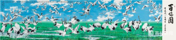 这次展览共展出71幅书画作品,寓意“七一”党的生日。其中一幅近6米长的《百鹤图》是这次展览的主题作品,由103位共和国老党员、老军人共同绘制完成,作者平均年龄85岁,90岁以上36位,100岁以上12位,年龄最大的是108岁开国少将、有着90年党龄的老红军张力雄,饱含着老党员、老军人对党百年征程的真情歌颂,以及对祖国美好明天的祝福。