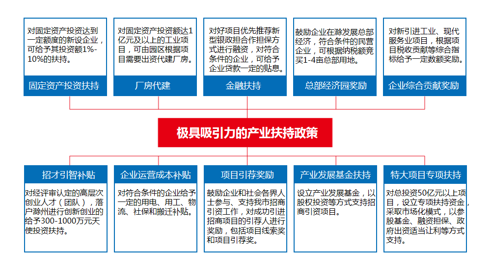 在赵主任的介绍中,还提及到滁州对于招商引资帮扶的内容,可谓角度全,罕留死角;力度大,不遗余力。从固定资产投资扶持、金融扶持、企业综合贡献奖励到项目引荐奖励、产业发展基金扶持,滁州市建立了一套科学完善的帮扶评审管理制度,实现精准帮扶,为真正的落地企业解决了后顾之忧,专心致力于优质项目的推进和发展。