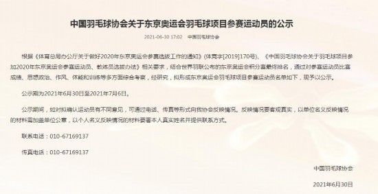 6月30日,中国羽毛球协会公布了国羽参加东京奥运会的名单,里约奥运会男单冠军谌龙三战奥运力争卫冕,陈雨菲领衔女单,郑思维/黄雅琼将向混双金牌发起冲击。