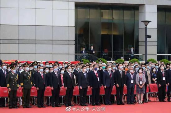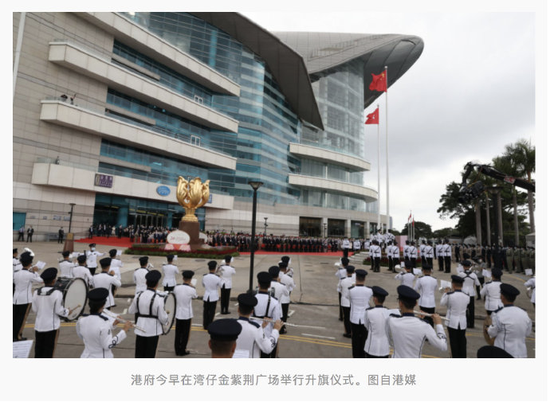 7月1日是香港回归24周年,适逢中国共产党成立100周年。香港特区政府早上在湾仔金紫荆广场举行升旗仪式,署理行政长官李家超、行政会议召集人陈智思,以及中央驻港机构部分代表出席。图源:大公报