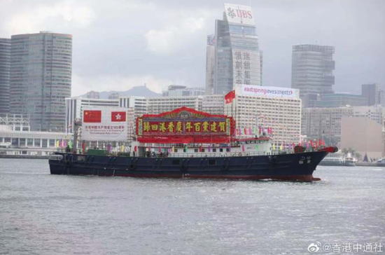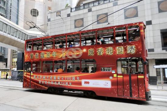 香港多辆巴士及电车车身喷上“贺建党百年庆香港回归”的庆祝标语 大公文汇全媒体记者李湃丰摄