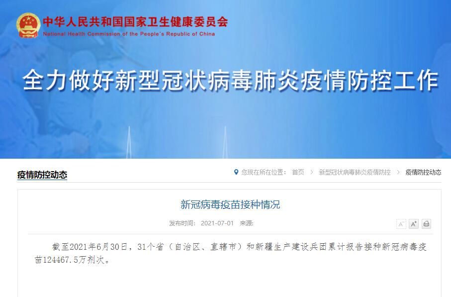 截至2021年6月30日,31个省(自治区、直辖市)和新疆生产建设兵团累计报告接种新冠病毒疫苗124467.5万剂次。