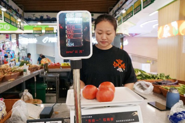 新城市集不仅在外部环境上与传统菜市场大不相同,还拥有智慧且可靠的内在。在新城市集一层主入口,电子显示屏上实时更新着食品安全检测信息、菜价交易、商户信息等内容。据介绍,新城市集采用智慧农贸市场溯源管理系统,每家商户统一配备智慧秤,顾客购买菜品时,称重情况和交易情况能直接传送至系统,保证信息公开透明,更方便管理与追溯。此外,一层还设有食品安全快检室,工作人员每天检测20批次的蔬菜水果农药残留,相关检测信息会在电子屏上公开,同时也会实时上传至苏州市食品安全追溯系统,由市、区监管部门进行监督。
