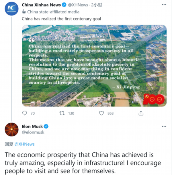 新华社海外社交媒体帐号也发布了中国实现了第一个百年奋斗目标的消息,马斯克则在这一消息下留言称:“中国取得的经济繁荣确实令人惊叹,尤其是在基础设施方面!我鼓励人们亲自(前往中国去)参观与见证。