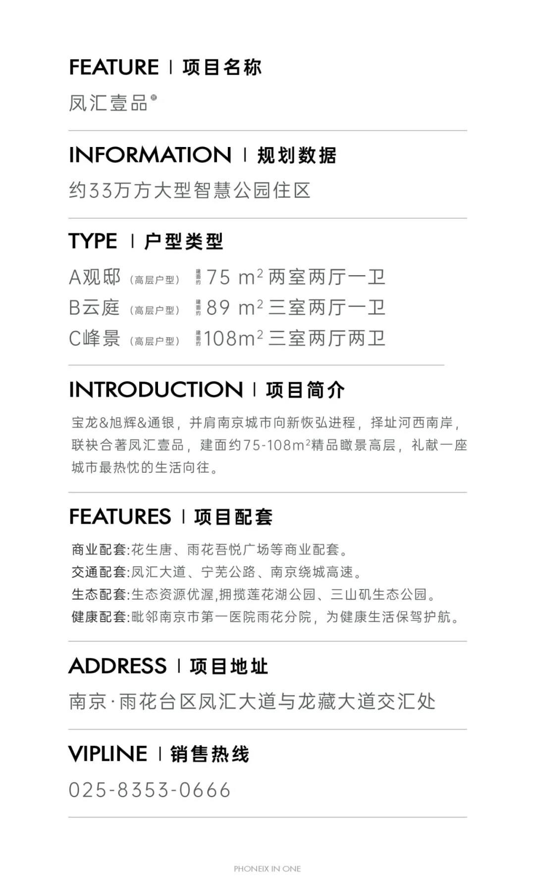 ·项目说明:1、项目推广名:凤汇壹品,备案名:凤汇壹品居;开发商:南京旭宝置业发展有限公司,许可证号:宁房销第2021100002号。资料所发布内容为2021年5月的信息,本公司保留对宣传资料修改的权利,如有改动,不另行通知,敬请留意最新资料。2、相关规划信息,后期如有变动,以当年相关政府部门文件公布资料为准。3、本广告中所有图片、资料、数据仅供参考,一切以政府最终批准文件及双方签订的买卖合同为准,南京旭宝置业发展有限公司在法律允许范围内拥有最终解释权。开发商:南京旭宝置业发展有限公司。