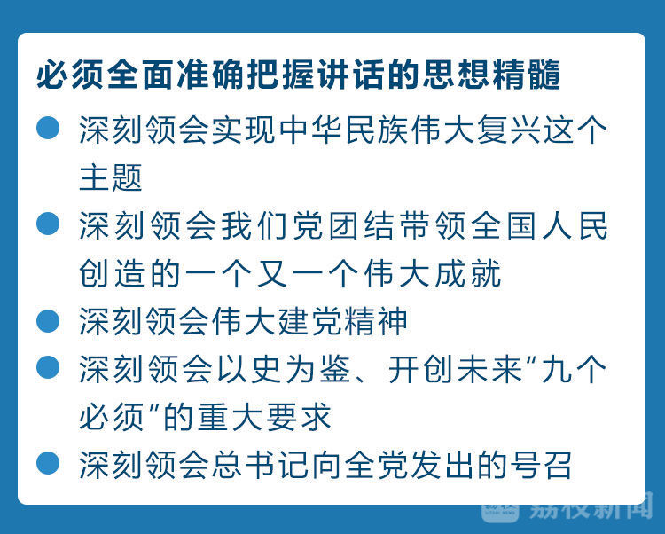 会议指出,习近平总书记“七一”重要讲话作出的一系列重大论断、提出的一系列重大要求,科学回答了党和国家发展的一系列方向性、根本性、全局性、战略性的重大问题,必须全面准确把握讲话的思想精髓,从中不断汲取信仰的力量、思想的力量、榜样的力量和奋斗的力量。要深刻领会实现中华民族伟大复兴这个主题,不忘初心、牢记使命,矢志不渝地为之奋斗、为之牺牲、为之创造;要深刻领会我们党团结带领全国人民创造的一个又一个伟大成就,毫不动摇坚持党的全面领导,切实增强“四个意识”、坚定“四个自信”、做到“两个维护”;要深刻领会伟大建党精神,继续弘扬光荣传统、赓续红色血脉、锤炼政治品格,更好担负起时代重任;要深刻领会以史为鉴、开创未来“九个必须”的重大要求,把已经取得的成绩看作事业新的起跑线,走好新的赶考之路;要深刻领会总书记向全党发出的号召,团结带领全省广大党员干部坚定理想信念,践行党的宗旨,沿着总书记指引的方向坚定前行,奋力书写好“强富美高”新江苏建设的现代化篇章。