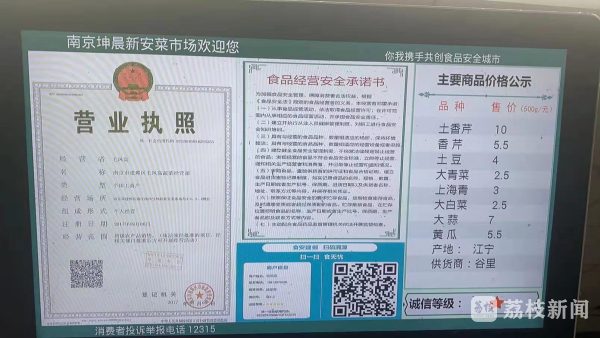 推广农贸市场商户信息电子公示屏。通过链接后台数据库,每个商户前设有一个电视机大小的电子屏,公示该商户的营业执照、食品经营许可证、从业人员健康证、菜品的价格及食品安全的溯源码等,消费者可通过使用手机扫描溯源二维码,即可查看该摊位菜品的溯源和快检信息,让市民群众买得放心、吃得安心。