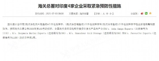 海关总署表示,因从进口自印度2批次冻杜氏叫姑鱼的4个外包装样本、1批次冻舌鳎鱼的1个外包装样本和1批次冻带鱼的1个外包装样本中检出新冠病毒核酸阳性,按照海关总署公告2020年第103号的规定,全国海关自即日起暂停接受印度水产品生产企业M/s. Asha Ganga Exports(注册编号为1170)、M/s. Deepmala Marine Exports(注册编号为199)、M/s. Rameshwar Cold Storage(注册编号为200)和M/s. Favourite Exports(注册编号为1189)的进口申报1周。