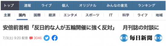 【环球网报道 见习记者 朱悦】日本前首相安倍晋三又惹上争议了。据日本《每日新闻》7月3日报道,安倍近日在接受某杂志采访时指责“反日的人才强烈反对举办奥运会”。此番言论随即引发日本网友不满,有网友反驳安倍称:“你才是反日分子”。