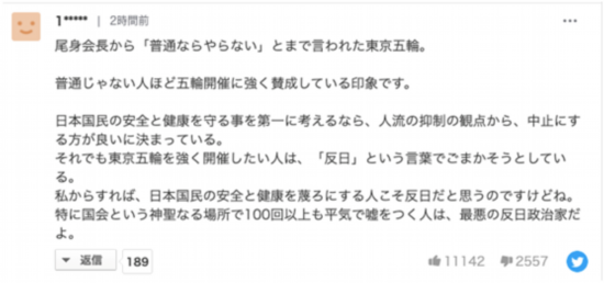 “如果把保护日本国民的安全和健康放在第一位考虑的话,从控制人流的角度出发,决定停办(奥运会)比较好。尽管如此,强烈支持举办东京奥运会的人却想用‘反日’这个词来搪塞过去。在我看来,蔑视日本国民安全和健康的人才是反日的。特别是在国会这样神圣的场所,毫不在乎地撒谎100次以上的人,是最恶劣的反日政治家。”