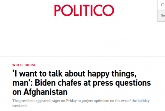 据美国“政客”新闻网站、《纽约邮报》2日报道,拜登是在一场庆祝就业增长的活动上发表的上述言论。“政客”网站称,拜登对有关阿富汗的媒体提问感到“恼火”。《纽约邮报》说,拜登打断了记者们的提问。