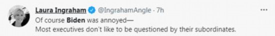 还有网友讽刺称,“拜登当然很恼火。大多数高管都不喜欢被下属质问。”