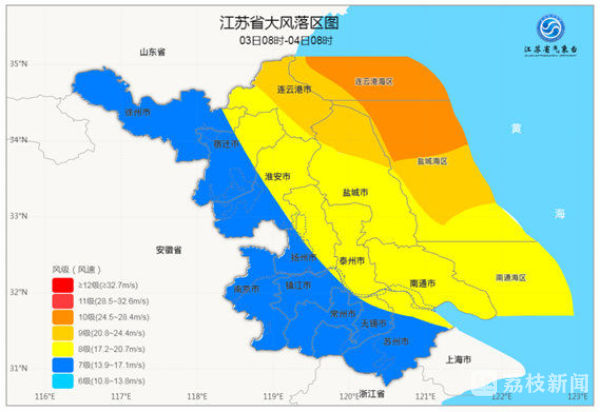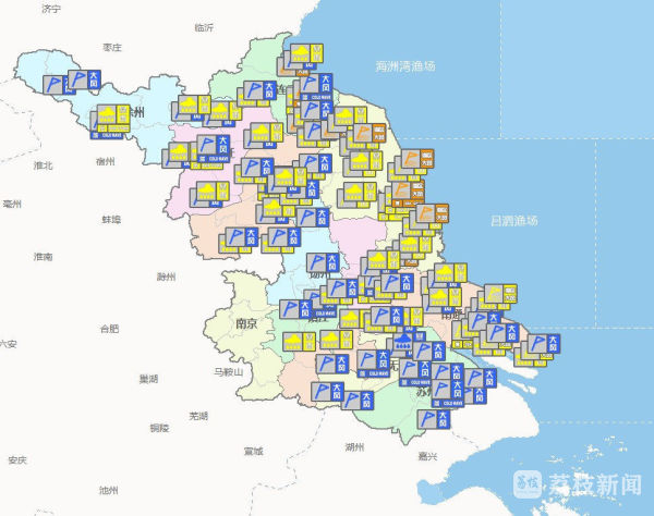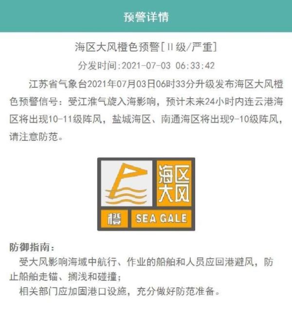 同时,江苏省气象台今晨6时33分升级发布海区大风橙色预警。受江淮气旋入海影响,预计未来24小时内连云港海区将出现10-11级阵风,盐城海区、南通海区将出现9-10级阵风。 提醒相关海域的船只及时回港避风,注意风浪影响!