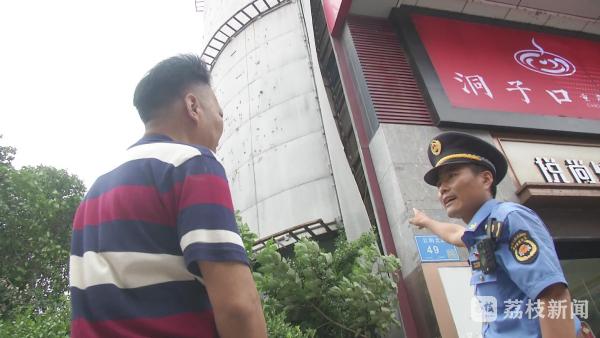 7月3日中午12点钟,记者在南京市鼓楼区云南北路49号天星翠琅大厦见到了正在巡查的鼓楼区城管大队湖南路中队工作人员,此时,执法人员正在要求大厦的负责人对户外的一块破损的广告牌进行加固。