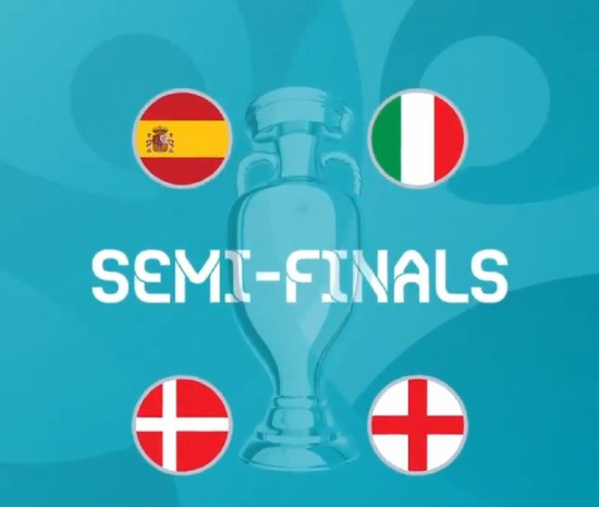 半决赛两场对决分别为意大利vs西班牙与丹麦vs英格兰。