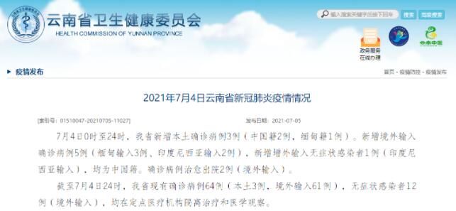 荔枝新闻消息 7月4日0时至24时,云南省新增本土确诊病例3例(中国籍2例,缅甸籍1例)。新增境外输入确诊病例5例(缅甸输入3例、印度尼西亚输入2例),新增增外输入无症状感染者1例(印度尼西亚输入),均为中国籍。确诊病例治愈出院2例(境外输入)。详情>>