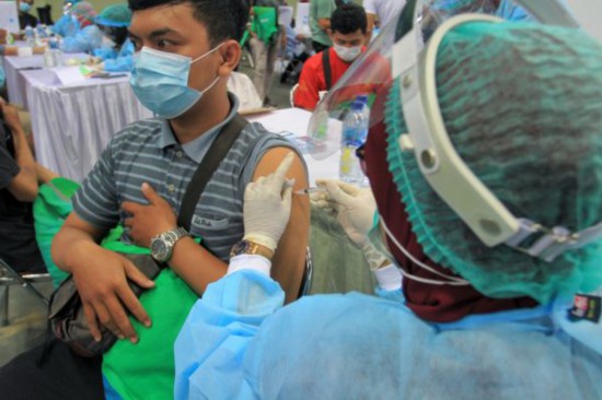 6月14日,一名男子在印度尼西亚日惹接种新冠疫苗。(新华社)