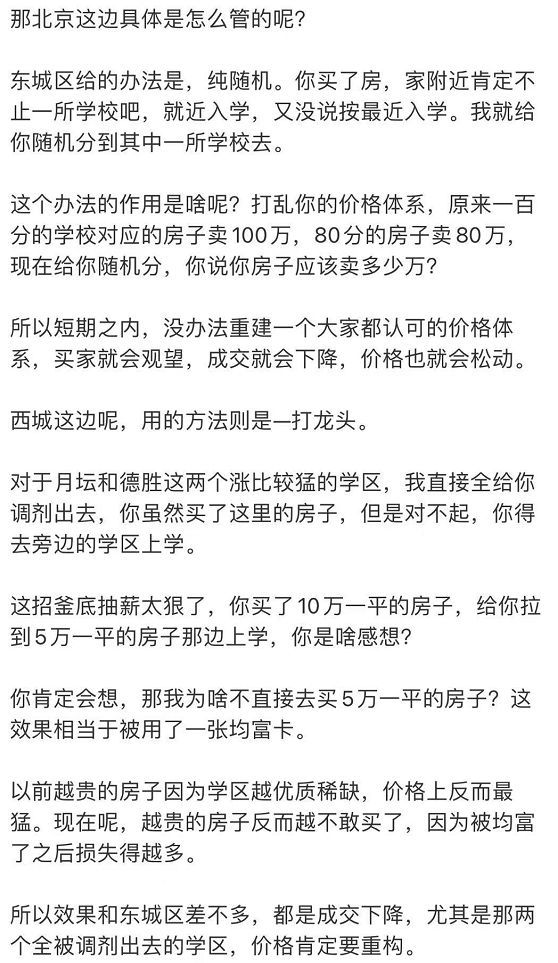 对于月坛和德胜这两个涨比较猛的学区,我直接全给你调剂出去,你虽然买了这里的房子,但是对不起,你得去旁边的学区上学。