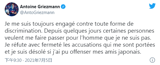 与此同时,格列兹曼当天也发推称,自己“一直致力于反对任何形式的歧视”,“我坚决驳斥对我的指责,如果我冒犯了日本朋友,我很抱歉。”↓