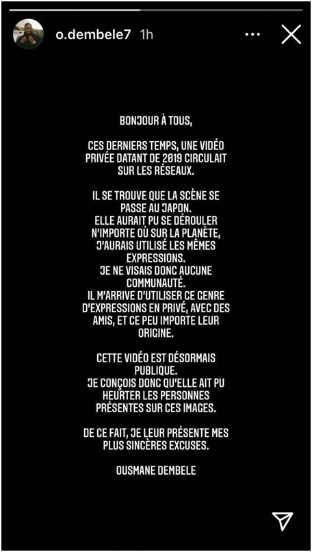 据报道,登贝莱当天在社交媒体Instagram发文称,不认为自己的言行应被视为歧视,“那一幕恰好是在日本。它可能发生在地球上任何地方,并且我都会使用同样的表达方式。”