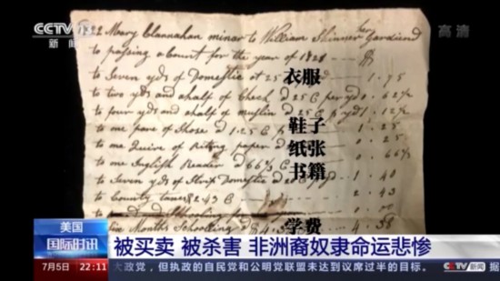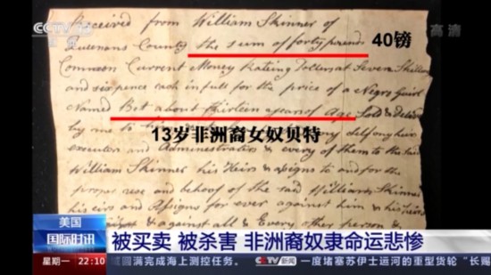 这是一张1789年的收条。收条记录了一名13岁非洲裔女奴的交易情况。买方约翰·斯金纳向奴隶主威廉·斯金纳以当时的货币支付了40镑。