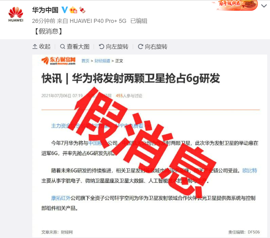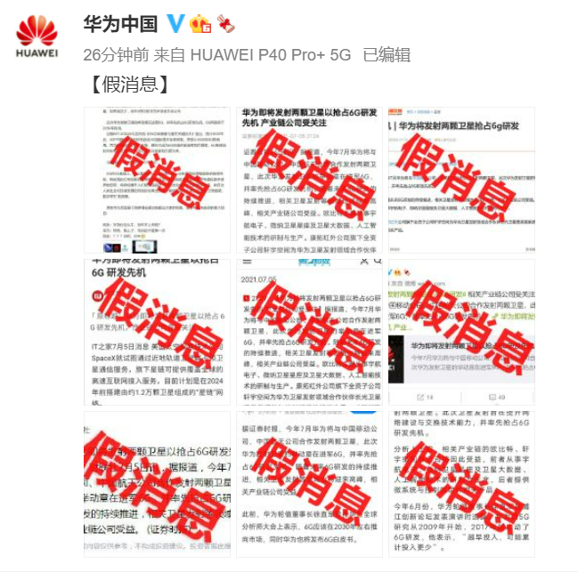 此前据媒体报道,今年7月华为将与中国移动公司、中国航天公司合作发射两颗卫星,此次华为发射卫星的举动意在进军6G,并抢占6G研发先机。6日上午,华为中国官方微博辟谣,“华为即将发射两颗卫星以抢占6G研发先机”为假消息。
