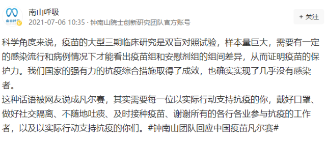 对此,钟南山院士创新研究团队在社交媒体官方账号“南山呼吸”上回应称,科学角度来说,疫苗的大型三期临床研究是双盲对照试验,样本量巨大,需要有一定的感染流行和病例情况下才能看出疫苗组和安慰剂组的组间差异,从而证明疫苗的保护力。我们国家的强有力的抗疫综合措施取得了成效,也确实实现了几乎没有感染者。