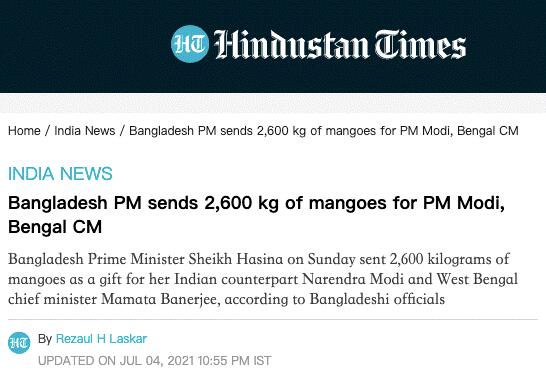 “芒果外交”,《印度斯坦时报》6日消息称,孟加拉国总理谢赫 哈西娜4日送出了2600公斤芒果,作为给印度总理莫迪和西孟加拉邦首席部长的礼物。而有印媒注意到,“此时正值孟加拉国对印度3月底来停止出口疫苗感到越来越不安之际”。