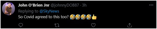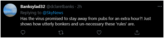 “在酒吧额外(开放)的一小时里,病毒承诺远离了吗?!(这)只会显得这些防疫规定多么的愚蠢透顶和不必要。”