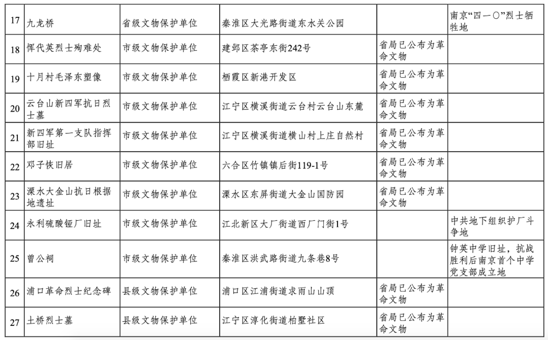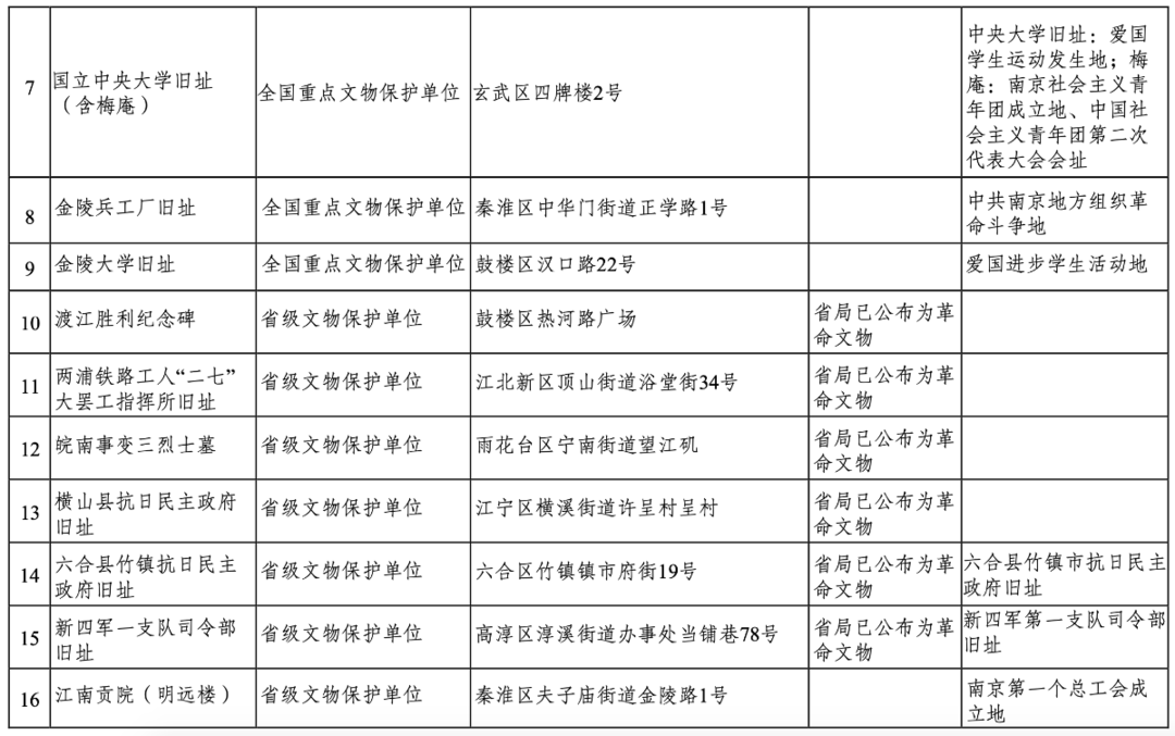 其中,雨花台烈士陵园、中国共产党代表团办事处旧址(梅园新村)、新四军一支队司令部旧址、南京长江大桥等都名列其中。