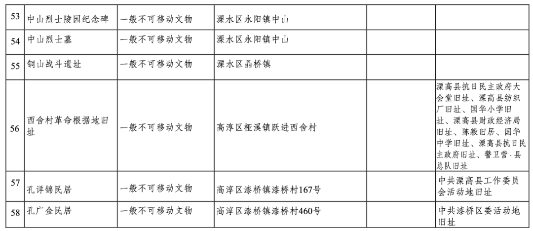 此次公布的革命文物名录全部为红色文化遗产,类型为重要革命机构旧址、重要历史事件及人物活动地、革命领导人故(旧)居、烈士陵园、纪念设施、文物藏品等。