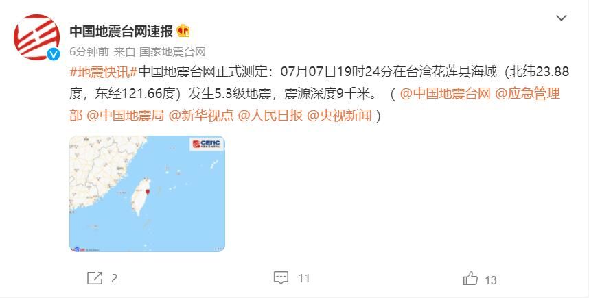 荔枝新闻讯 中国地震台网正式测定:07月07日19时24分在台湾花莲县海域(北纬23.88度,东经121.66度)发生5.3级地震,震源深度9千米。