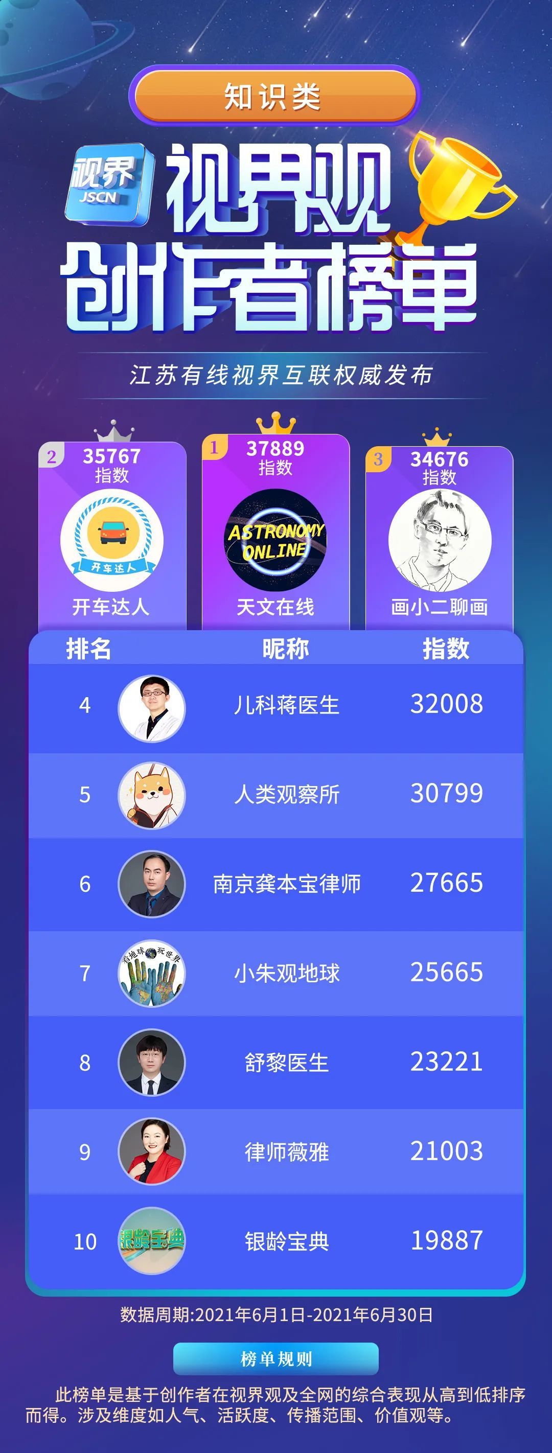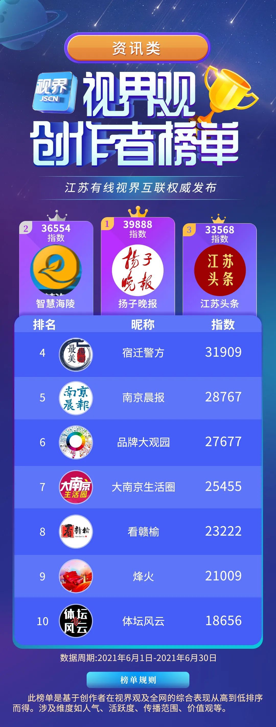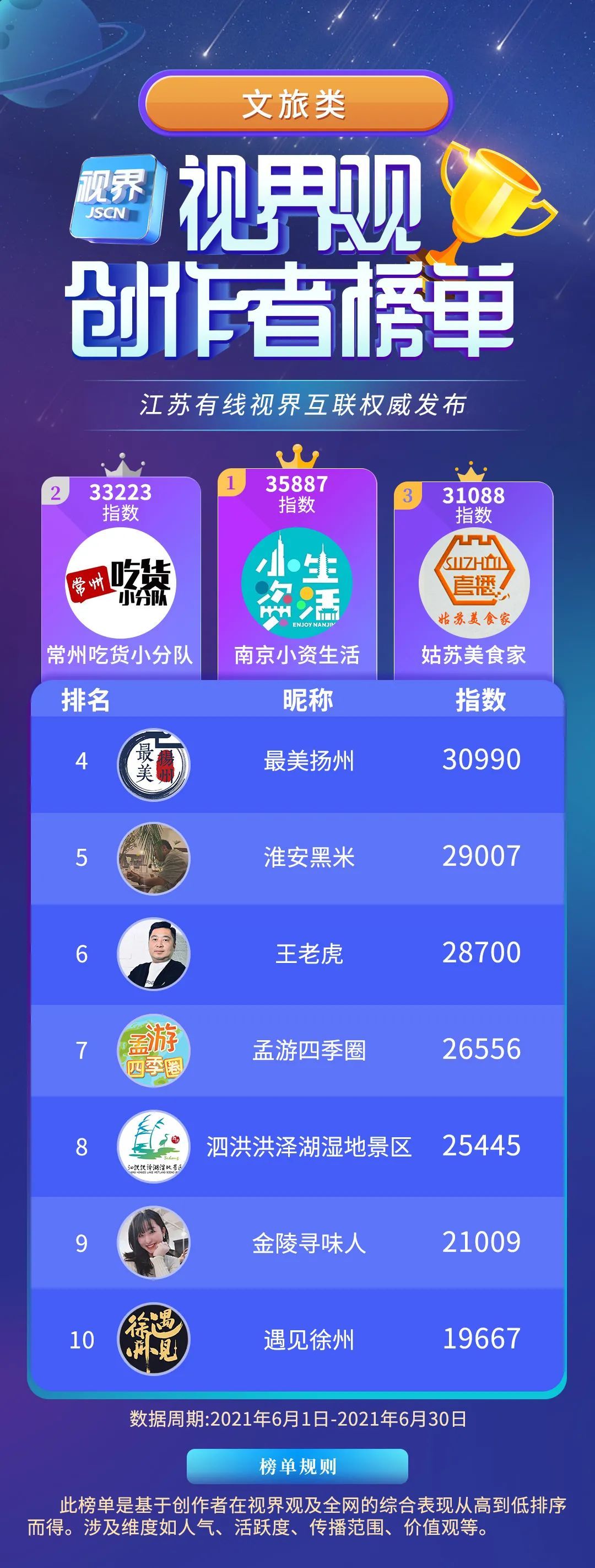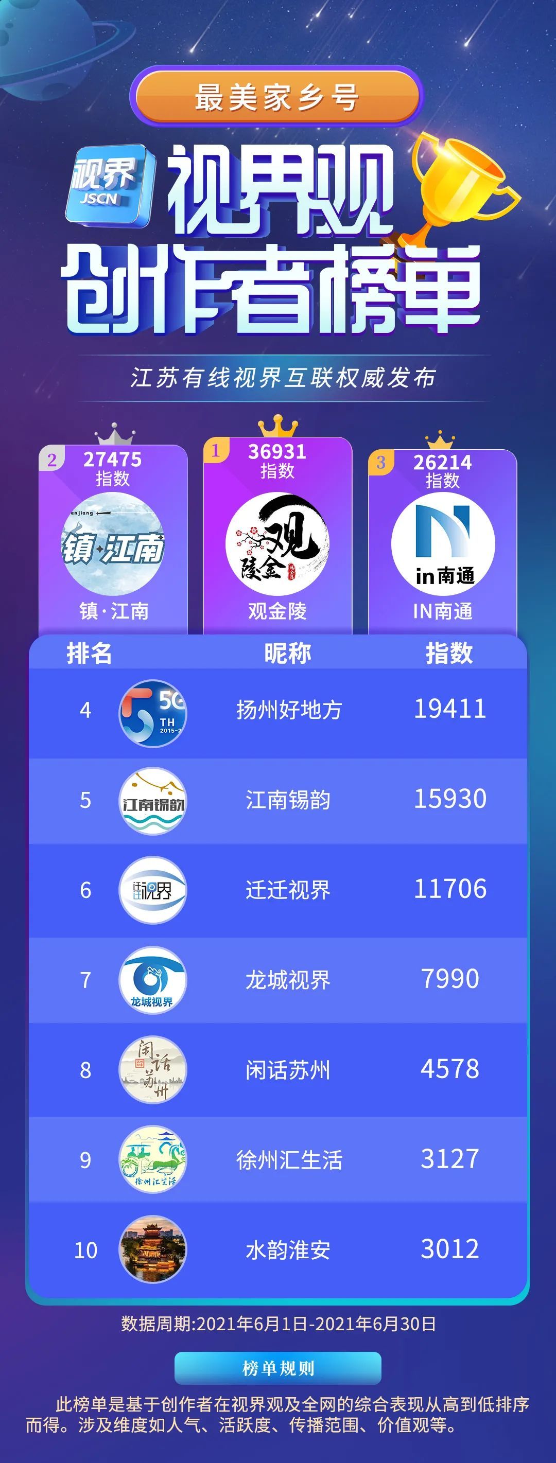 根据计划,平台从泛资讯、泛知识、泛文旅、泛生活、泛影视五大垂直赛道中各选出10位创作者,与以往不同的是,本次榜单新增了“最美家乡号”赛道,旨在鼓励江苏13地市家乡号创作出更多立足于本土文化的优秀内容。依托用户大数据和“繁星计划”签约创作者的运营数据,视界观APP建立了全面的视频数据样本库,并进行持续统计。所有数据的获取均取自客户端展示页面,秉持“公正公平公开”的原则,榜单的最终出炉考虑到了人气、活跃度、传播范围、内容贡献度、价值观等多重维度。